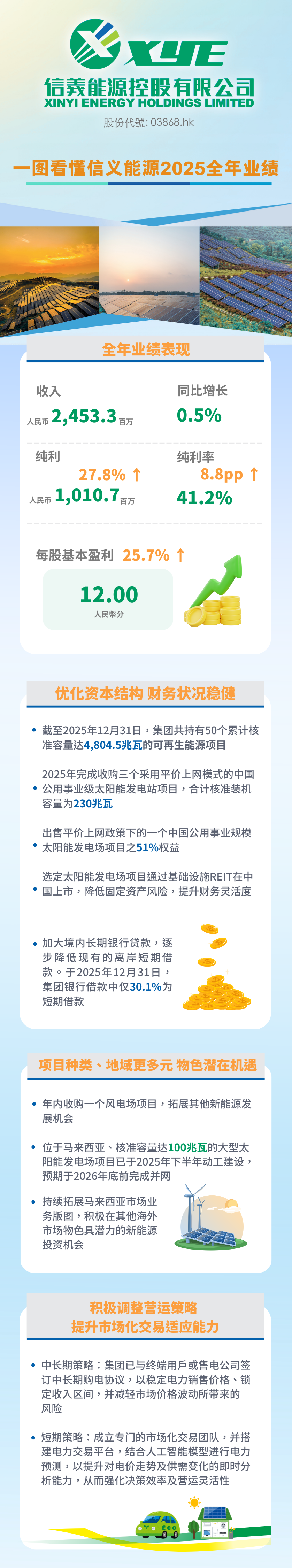 信義能源主席兼执行董事李圣泼先生(铜紫荆星章)总结:「二零二五年,于光伏行业阶段性政策调整与市场波动中,集团秉持审慎稳健的经营策略,成功维持稳健业务表现,并持续优化财务结构。金寨信義风能的股权收购则进一步完善了我们风光互补的业务布局,增强资产组合抵御经济周期的能力。同时,我们积极调整营运策略,推动短期与中长期布局整合,以提升市场化交易适应能力。